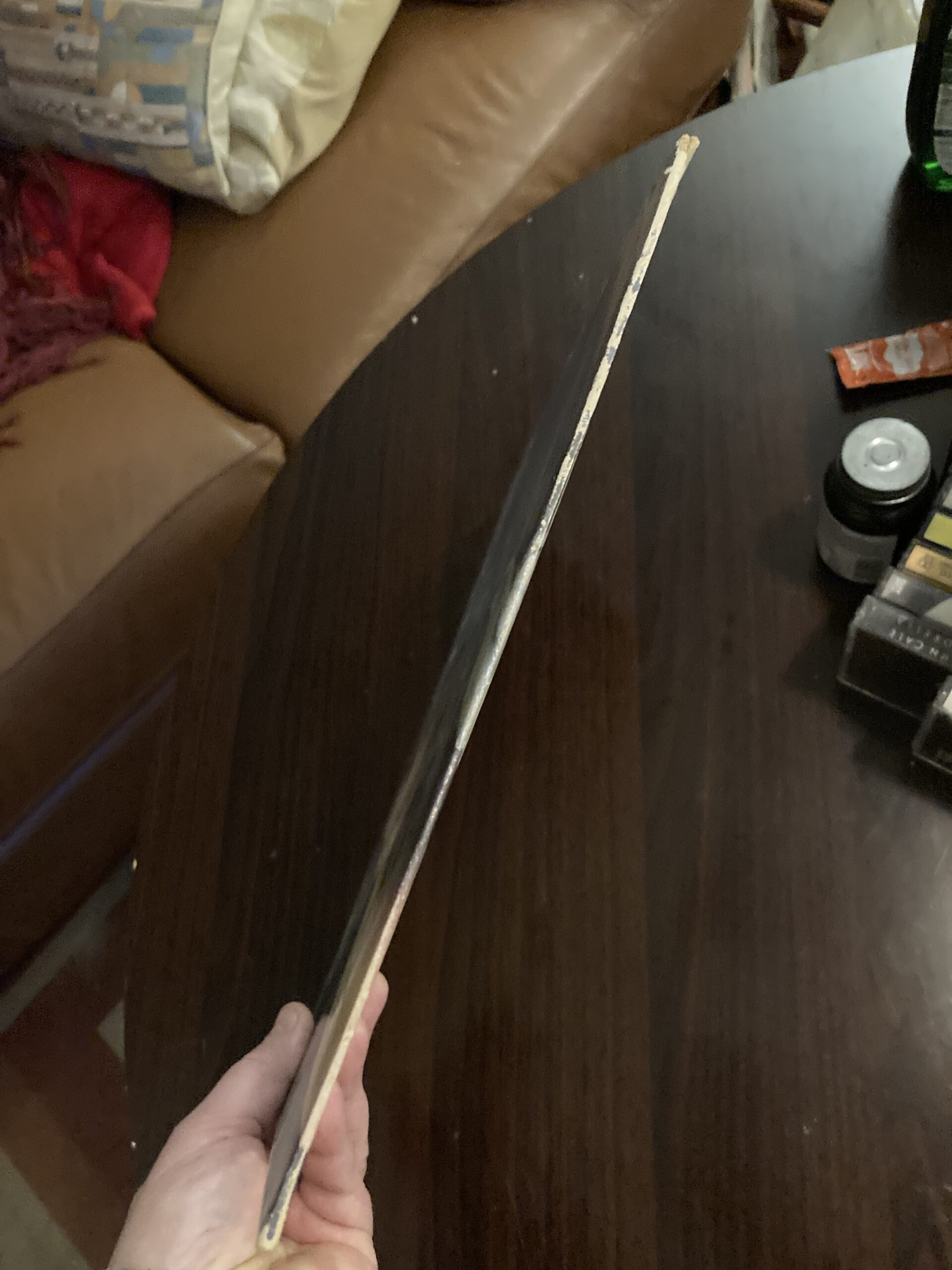 This one, the record’s jacket has a little wear, but it is not a ton to the panels. It is more important to note that the edges have a little bit of minor damage, in flaking. The top edge has a little splitting starting at the opening, but again, it is small – you can see it in the zoomed image (I loaded the top edge first). The bottom edge does not have as much flaking to it, and is not splitting. The spine is still solid all the way thru it.